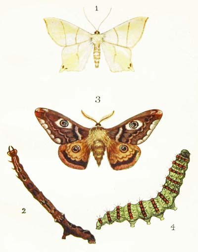 There is a Brimstone Moth, just as there is a “brimstone butterfly,” and you may find it very commonly indeed in almost any part of the country, and at almost any time from April until October, or even November. During the daytime it generally hides away among the leaves of ivy, or of some thick bush, like the “swallow-tailed moth.” But you may sometimes see it resting on a fence, or on the trunk of a tree; and after dark it often comes flying into a lighted room through an open window. The caterpillar feeds on hawthorn, and blackthorn, and apple, and sometimes on bramble. It is pale brown in colour, with a bluish spot on each side of its neck, and with three little humps on its back, just like the tiny leaf-buds on a bit of twig. So although it is so common you will not find it unless you look very carefully indeed, and even the sharp eyes of the insect-eating birds often pass it by. As soon as it reaches its full size it spins a thick silken cocoon and turns into a brown chrysalis, out of which the moth appears two or three weeks later.