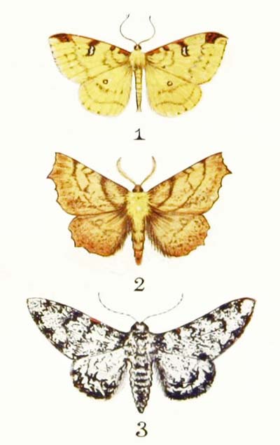 There are several different kinds of “Thorn” moths, but you can always tell the Canary-Shouldered Thorn from the others by just looking at the middle part of its body, which is thickly covered with very long hairs of a bright canary yellow. It appears on the wing in August, and is very fond of flying into a lighted room after dark. Sometimes, too, it will sit on the glass of a street-lamp and remain there all night long without moving, gazing at the flame within. If it can get inside the lamp, it will often burn its wings so badly that it cannot fly away. And just now and then you may find it sitting on a fence, or on the trunk of a tree.