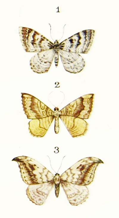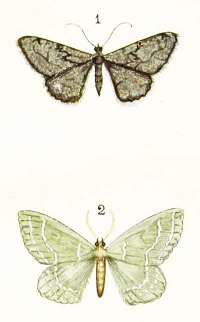 This very pretty moth is one of the first to make its appearance after the winter is over, for you may see it resting on fences and walls in March, and sometimes even in February. But you may easily pass it by without noticing it, for it is very fond of sitting among splashes of mud, which it resembles so much that you may look straight at it from a distance of only a few feet, without seeing what it really is. It varies in colour almost as much as the magpie moth, for sometimes it is nearly white all over, and sometimes it is nearly black; but generally the wings are greyish-white, with a few narrow black stripes.