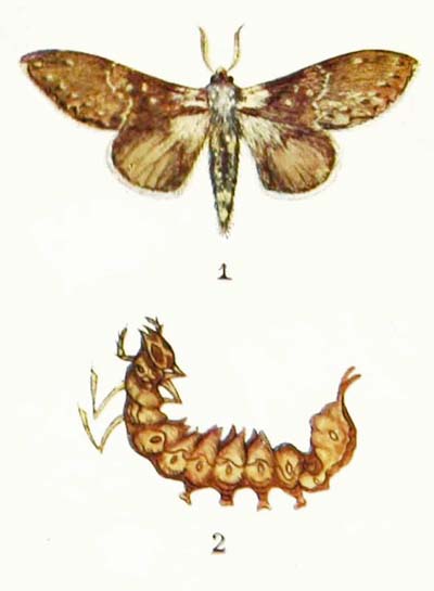 The caterpillar of this moth feeds on the leaves of various fruit trees, on which you may find it in May. It has a smooth, velvety body of a dingy brown colour, with a number of paler and darker markings, and on the back is a row of eight dark spots shaped just like lozenges.