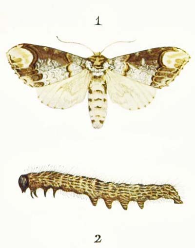 The caterpillar of this moth feeds first of all upon the catkins of sallow bushes. But when they begin to die off it goes down to the ground, and feeds upon the leaves of plantains and other low plants instead. In colour it is reddish-brown, with a number of brown, red, yellow, and white dots all over its body.