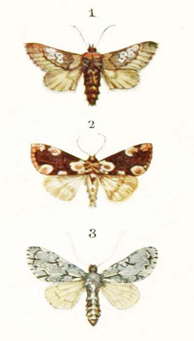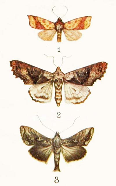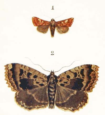 This is really a most lovely little moth. It is something like a very, very small “large yellow underwing.” But instead of having the front wings plain light or dark brown, with hardly any markings at all, it has them bright red-brown with pure white spots and wavy lines, while the hind-wings are of the brightest possible yellow, with a broad edging of glossy black.