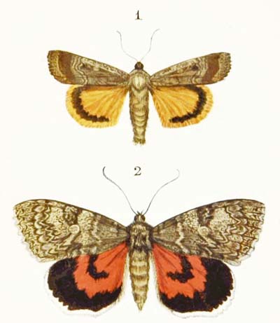 The caterpillars of both the Orange Underwings are dull green in colour, with yellow lines on their backs and sides, and when they walk they hunch their bodies up into loops, just like the “stick” caterpillars of such moths as the “swallow-tail” and the “willow beauty.” That of the Light Orange Underwing feeds on aspen, and that of the Dark Orange Underwing upon birch. You may find both in June and July.