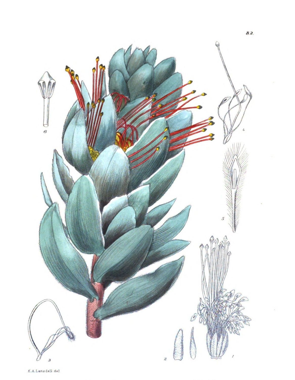 Plate 82.—Fig. 1, a single head; Fig. 2, bracts; Figs. 3, 4, a single flower; Fig. 5, perianth-segment enlarged; Fig. 6, stigma enlarged.
