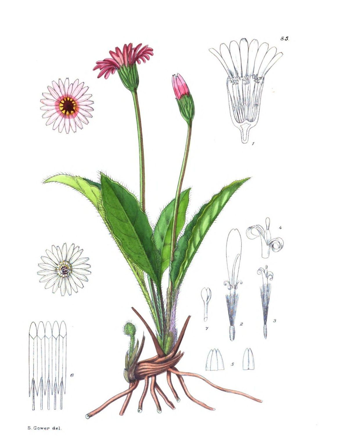 Plate 85.—Fig. 1, longitudinal section through head showing the convex receptacle; Fig. 2, a ray-floret; Fig. 3, a disc-floret; Fig. 4, upper portion of corolla of disc-floret; Fig. 5, apices of lips of disc-floret; Fig. 6, stamens; Fig. 7, upper portion of style of disc-floret showing the two lobes.