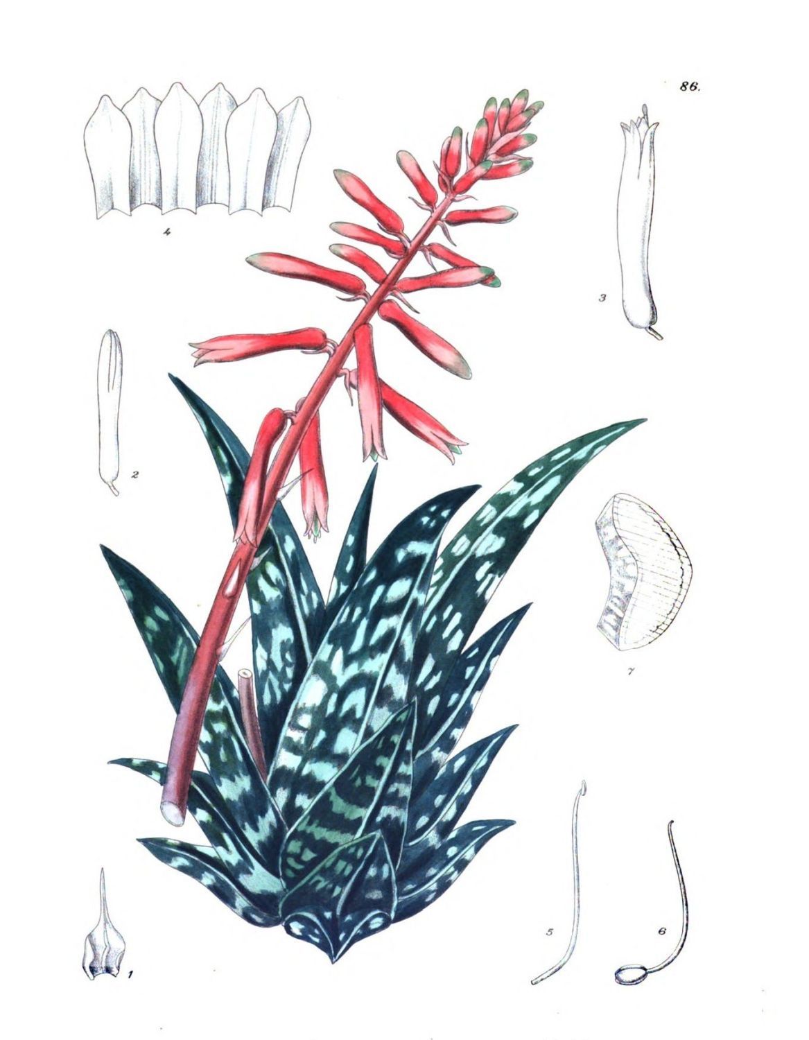 Plate 86.—Fig. 1, bract; Fig. 2, bud; Fig. 3, mature flower; Fig. 4, upper part of perianth laid open; Fig. 5, stamen; Fig. 6, pistil; Fig. 7, cross-section of leaf. N.B.—In the coloured drawing the leaves are half natural size, but the inflorescence is natural size.