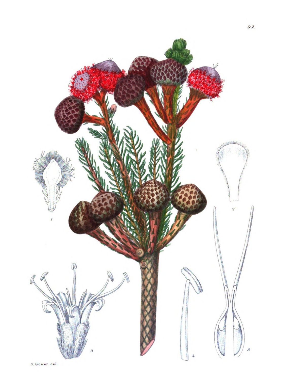 This member of the family Bruniaceae differs from that previously figured (Brunia Stokoei, Plate 92) in having a tubular corolla. In this respect it is also unique in the family. The genus is a small one, comprising only four known species.