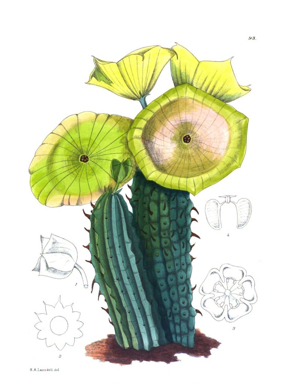 Description:—Roots tuberous, sometimes up to 50 cm.{136} in diameter. Stems striate. Leaves 8 to 14 cm. long, digitately 3-to 5-lobed; the middle lobe pinnatisect; the side lobes again lobed on one side only or pinnatilobed, more rarely almost entire; the mid-rib prominent above and beneath, and with two prominent glands on the upper side at base of the lamina, and with glands beneath at the base of each leaf-segment, glabrous; petiole 1·3 to 1·7 cm. long, 6 to 7 mm. broad, flat above, convex beneath, glabrous. Calyx-tube 1·5 cm. long, campanulate, 1 cm. in diameter above, narrowing to 1·5 mm. in diameter at the base, glabrous; lobes 7 cm. long, 5·5 mm. broad, ovate, obtuse, glabrous; two lobes with entire, the other three with lacerated margins. Petals 9 mm. long, 2·5 mm. broad at the widest part, obovate, acuminate, obtuse, narrowed at the base, with shortly ciliated margins, 3-nerved. Filaments united at the base, 4 mm. long, linear, broadening at the base; anthers 6·5 mm. long, 1·5 mm. broad, linear, falcate when seen in side view. Glands at base of filaments ·5 mm. long, more or less quadrate. Style 1 mm. long, bilobed at the apex. Corona represented by a fimbriated rim. Fruit fleshy, 3·5 cm. long, 2·5 cm. in diameter. Female flower not seen. (National Herb. Pretoria, No. 2639.)