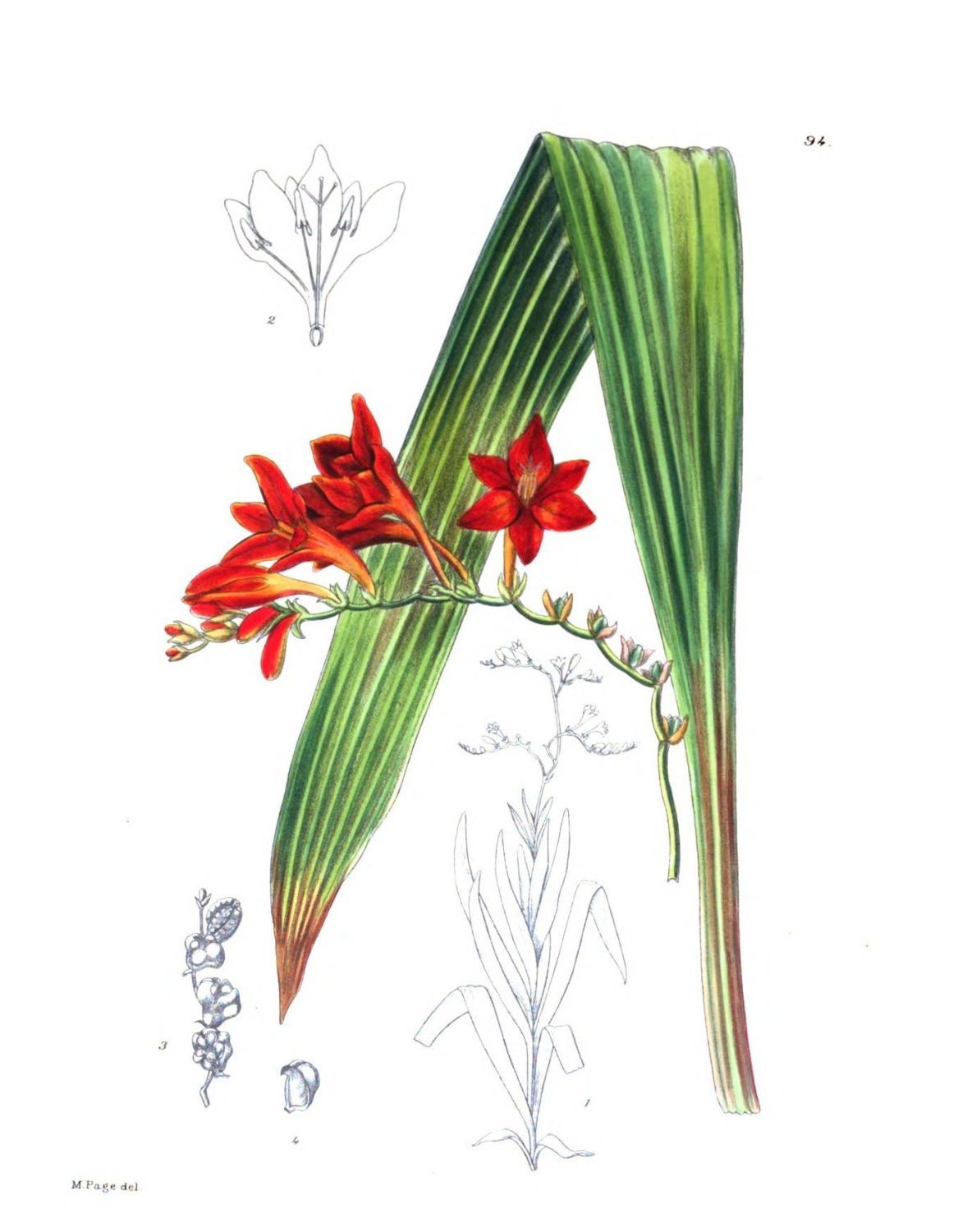 Description:—Corm 3 cm. in diameter, globose, covered with fibrous tunics. Plant 1 to 1·5 m. high. Leaves 10 to 12 to a plant, equitant, up to 70 cm. long, 2·5 to 3 cm. broad, ensiform, acuminate, acute, with a prominent midrib above and beneath, and with the lateral veins distinct, with a cartilaginous margin which is sometimes very minutely denticulate, glabrous. Spike ·3 to almost 1 m. long, up to 15-flowered. Outer spathe 8 cm. long, 2·1 cm. broad, ovate, acuminate, acute, closely nerved, glabrous; inner spathe 6 cm. long, 1·8 cm. broad, ovate, acute, 2-keeled, glabrous (in the flowering{148} stage spathes are smaller). Perianth-tube 4 cm. long, 1 cm. in diameter above, yellow on the posterior side, red on anterior side. Upper lobe 5·5 cm. long, 3·2 cm. broad, obovate, narrowed to the base, shortly cuspidate; side lobes 4·5 cm. long, 3·5 cm. broad, ovate, obtuse; lower lateral lobes 3 cm. long, 1·5 cm. broad, elliptic, narrowed to the base, acuminate, acute; lowest petal 3·5 cm. long, 1·8 cm. broad, elliptic narrowed to the base, cuspidate at the apex. Anthers 1·6 cm. long, linear, sagittate at the base. Style 7 cm. long, terete, glabrous; lobes 6 cm. long, spatulate, papillose on the margins. Young fruit 4·5 cm. long, 3-angled. Seeds winged. (National Herb. Pretoria, No. 2711.)