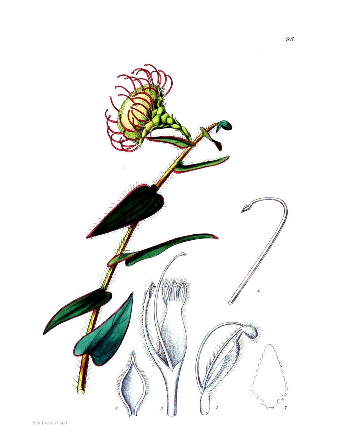 Description:—Branches finely tomentellous, at length glabrous. Leaves 3¼-4½ in. long, ¾-1½ in. broad, strongly{20} imbricate, ovate to ovate-lanceolate or elliptic-oblong, obtuse with a callous point, sub-cordate or rounded or slightly narrowed at the base, coriaceous, prominently veined, glabrous, with the margins shortly villous or at length glabrous. Head sessile, 4 in. long, about 2½ in. in diameter. Involucral-bracts 8-seriate; outer ovate, obtuse, villous-pubescent or more or less glabrescent, with a dense fringe of woolly hairs; inner more or less flesh-colour to carmine with an oblong limb and a linear claw, finely villous-tomentose, tips densely ciliate, exceeding the flowers. Perianth-sheath 2 in. long, dilated, 5-nerved and 3-keeled below, finely tomentose, glabrous at the base; lip over 1 in. long, 3-awned, lateral awns 3-4½ in. long, filiform, flexuous, tawny to purplish-tomentose; median awn 1 in. long, filiform. Fertile stamens 3, sub-sessile; filaments ¾ in. long, flattened; anthers linear, 4½ in. long; apical gland almost 1 in. long, lanceolate-oblong; barren stamen 4½ in. long, linear, eglandular. Ovary 1 in. long, oblong, densely covered with long light-golden hairs; style 2 in. long, finely grooved on the convex side, glabrous; stigma 2½ in. long, linear, obtuse, strongly keeled and bent at the junction with the style.