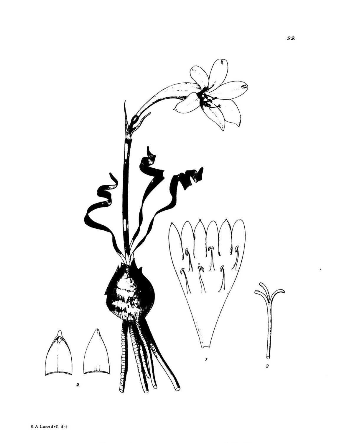 Description:—Bulb 1·8 cm. long, 1·5 cm. in diameter, globose, covered with papery tunics and produced into a neck about 1 to 1·5 cm. long. Leaves usually one, more rarely two, 9 cm. long, filiform, quite terete or with a shallow channel, glabrous. Peduncle 15 cm. long, terete, glabrous. Inflorescence a centripetal umbel of about nine flowers. Spathe-valves 2 mm. long, ovate, acute. Pedicels 8 mm. long, terete, glabrous. Perianth-segments 8 mm. long, 1·5 mm. broad, linear, much crisped, with 3 segments minutely and bluntly apiculate and with papillae at the apex. Filaments{164} attached to base of perianth-segments, 5 mm. long, terete; anthers 1 mm. long, orbicular, basifixed. Ovary 2·5 mm. in diameter, globose, glabrous with a single ovule in each cell; style 7 mm. long, terete; stigmas 3, papillose. (National Herb. Pretoria, No. 2713.)