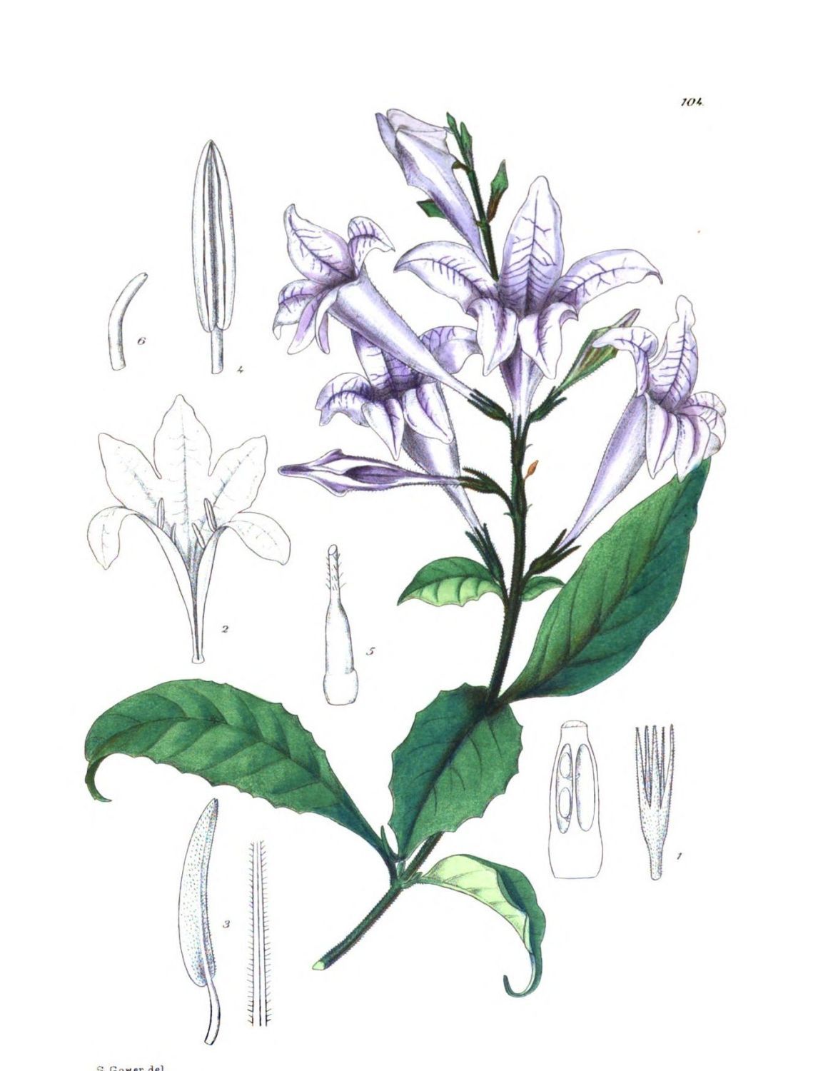 Plate 118.—Fig. 1, corolla laid open; 2, bract and bracteole; 3, leaf and calyx; 4, anther; 5, pistil; 6, cross-section of ovary.