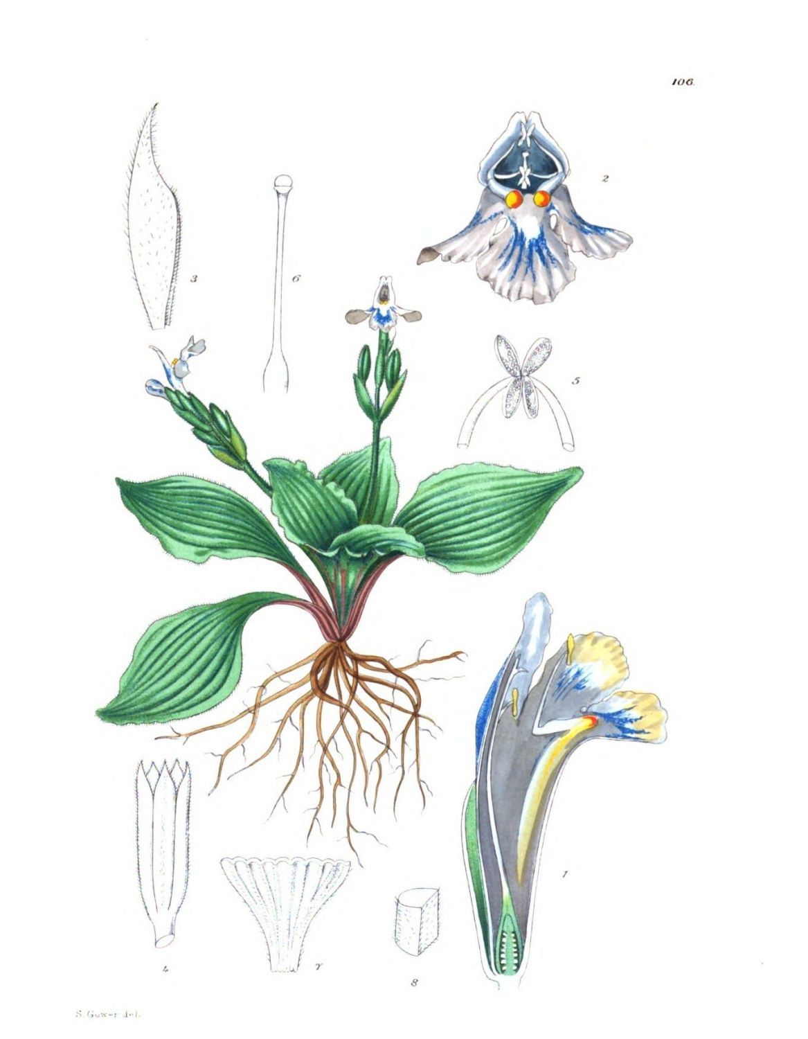 Plate 119.—Fig. 1, plant much reduced; 2, bract; 3, median longitudinal section of flower; 4, sepal; 5, side petal; 6, 7, lip; 8, column.