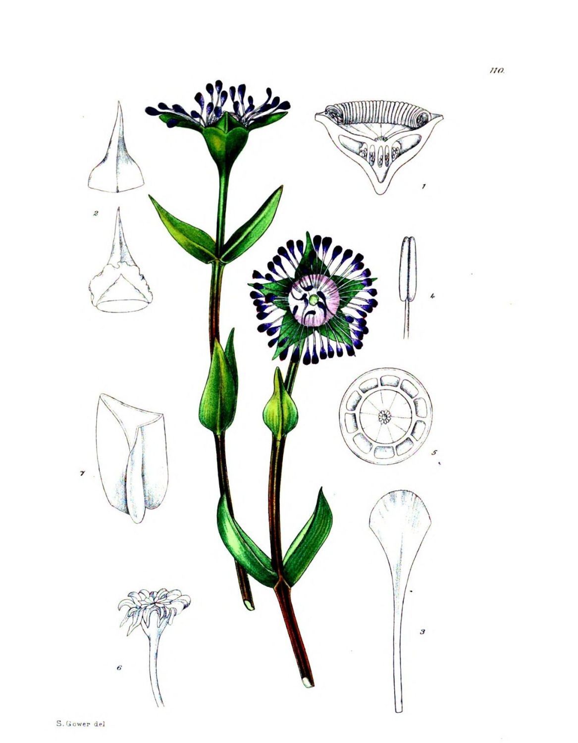 Plate 110.—Fig. 1, median longitudinal section of flower with sepals and petals removed; 2, sepals; 3, petal enlarged; 4, stamen; 5, cross section of ovary; 6, fruit; 7, section of leaf.
