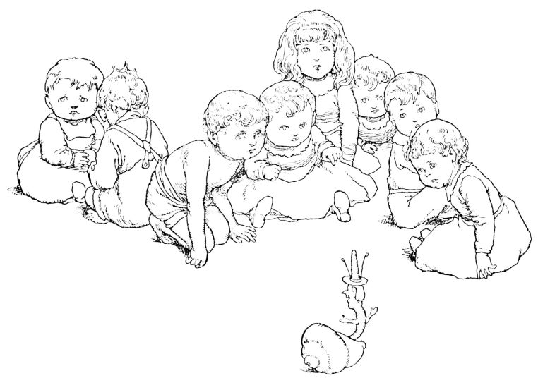 When she woke towards daybreak she was terribly frightened. The little child had vanished! She sprang up, lighted a brand, and looked everywhere around. There, just{9} at the foot of the bed where she had lain, was, not a baby, but a great ugly toad! In utter disgust at it she took a heavy stick to kill it, but the creature looked at her with such wonderfully sad eyes that she could not destroy it. Once more she gazed round; the toad uttered a faint, mournful croak. She started, and sprang from the bedside to the window, and opened it. At that moment the sun rose, and cast its rays upon the bed and upon the great toad. All at once it seemed that the creature’s wide mouth shrank, and became small and rosy; the limbs filled out into the most charming shape. It was her own beautiful babe that lay there, not the hideous reptile!
