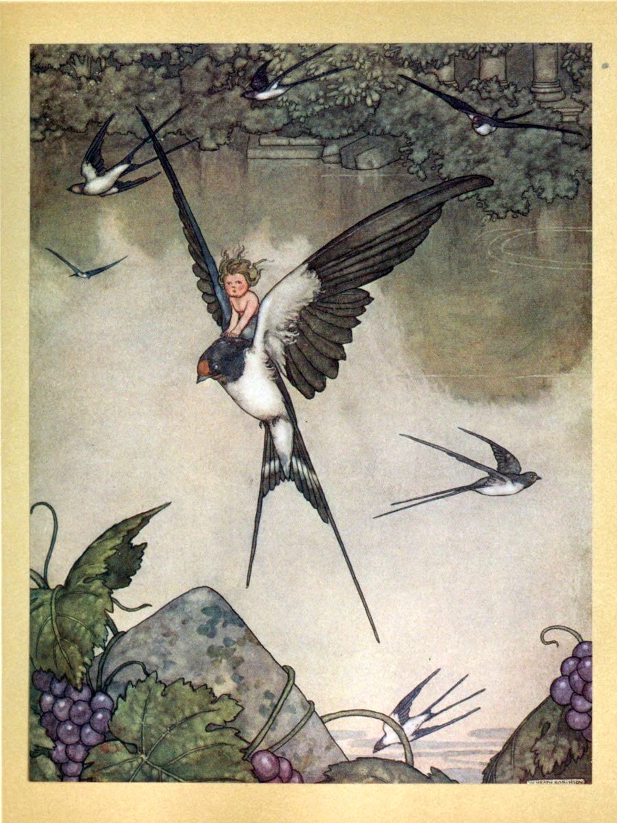 ‘We all three flew high in the air: a hunter saw us and shot an arrow; it struck our friend, and singing her farewell, like a dying swan, she slowly sank, in the midst of a forest lake. There we buried her, near the shore of the lake, under a fragrant weeping-birch. But we took our revenge! We bound fire under the wings of a swallow which had built under the hunter’s thatched roof! The thatch caught; the house blazed up! He was burned in it, and the light shone over the lake as far as the drooping birch tree under which she is buried. She will never come back to the land of Egypt.’