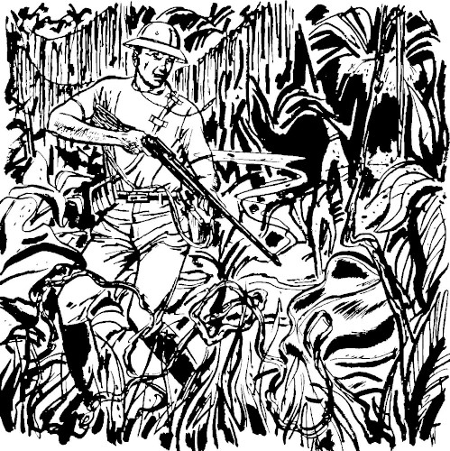 I staggered off into the fern-brake and sat down. I was groggy and I didn't know what had hit me. There still wasn't a sound in the jungle. When I brought my hand up to my ear and brought it away again, it was red and wet and glistening with blood. I turned around slowly, stiffly—
