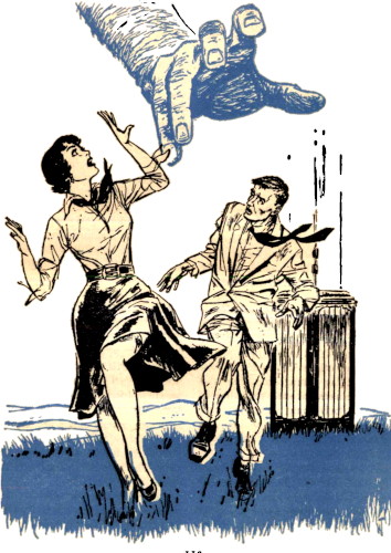 The giant stopped, took a few quick steps in their direction and was upon them. Carter knew then, that they were lost. A huge hand swooped down and lifted Walter Maltby into the air. Far above, Carter saw the terrified Maltby being transferred carefully to the giant's other hand. Now Wilmer Payton and Peggy Wilson were running blindly in two directions, Peggy having been suddenly deserted by her protector. Twice more the huge hand descended and the two also vanished into the vast palm.