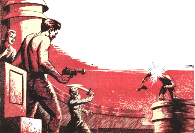 In the meantime, the guard brought his gun around to bear on the Martian. The later made a second desperate thrust. It went home but only as the Martian fell dead from the guard's last shot. Rex got to his feet, wiping sweat from his face.