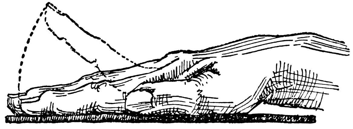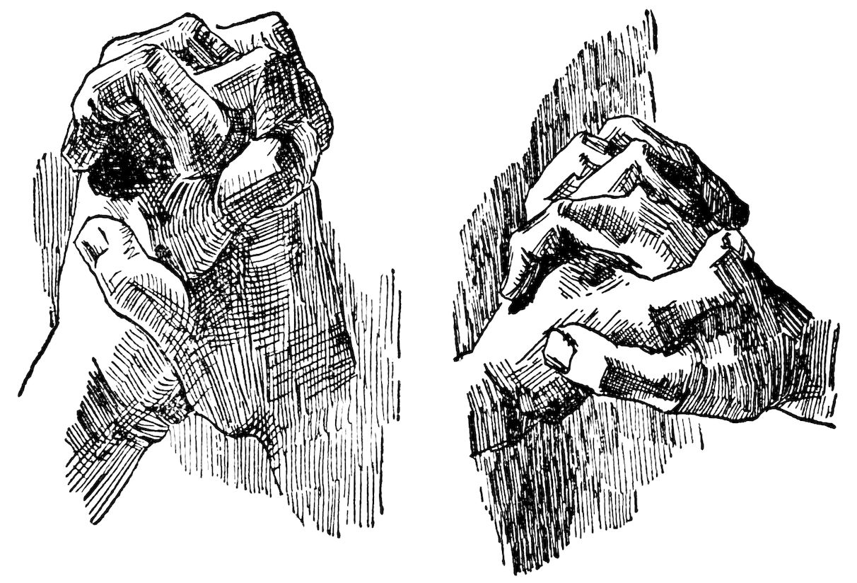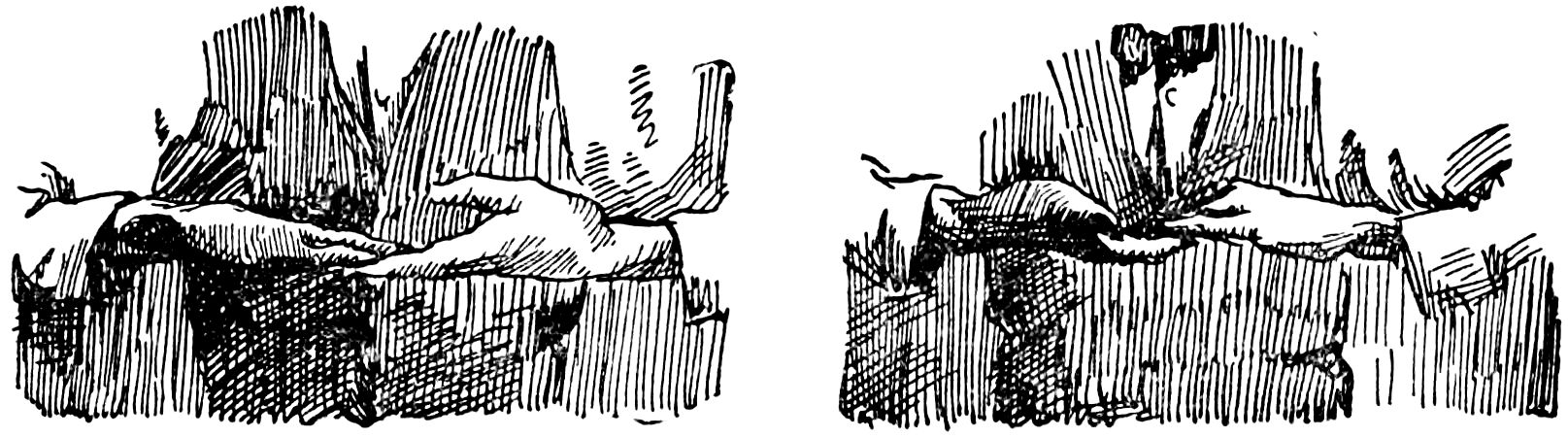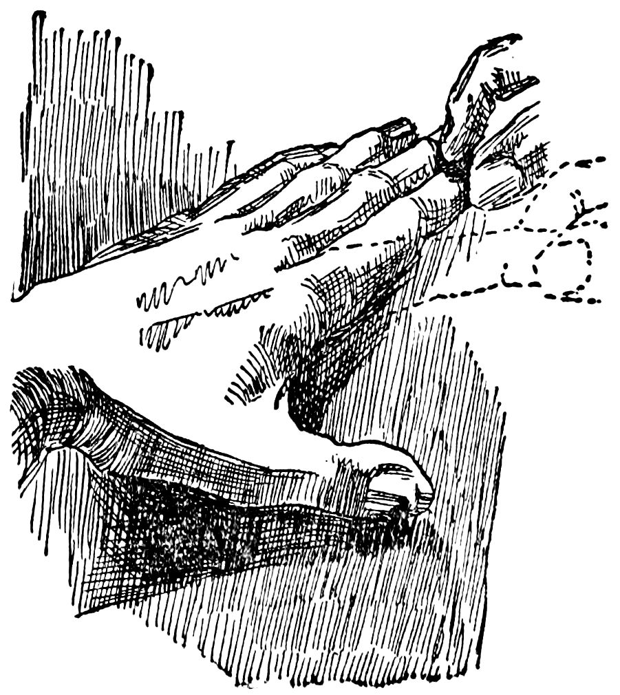 Hold your left arm across the chest palm up, but with the wrist bent as far down as possible, the fingers easily curled. Place the right arm in a similar position, but with the palm down, having the wrist of the right hand bent upward and fingers similarly curled. Lay the finger tips of the right hand on those of the left. From this position twist the forearms in opposite directions until the finger tips again come together, this time the palm of the right hand bent up, and of the left bent down.