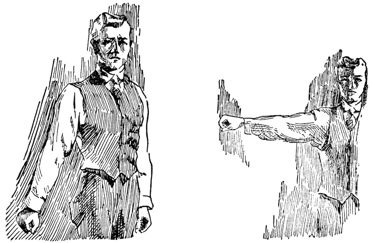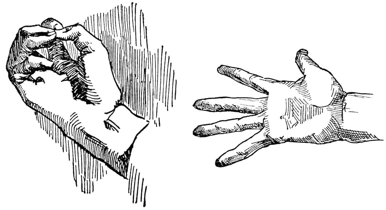 Hold your right hand before you, double up your fist tightly, thumb on the outside of the fingers. The hand turned with the palm side facing you. Open the hand briskly and with considerable effort, letting it turn around, so that the back of the hand is now turned toward you. Be sure to get this point and turn the hand around as you open the fingers. As you open the hand, be sure to keep the fingers stiff and bend them back from the wrist as far as possible. Repeat this exercise twenty times.