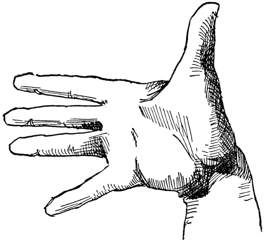 Lay the left hand flat palm down on a table, book, or other smooth surface. Open the thumb out of the way of the fingers.