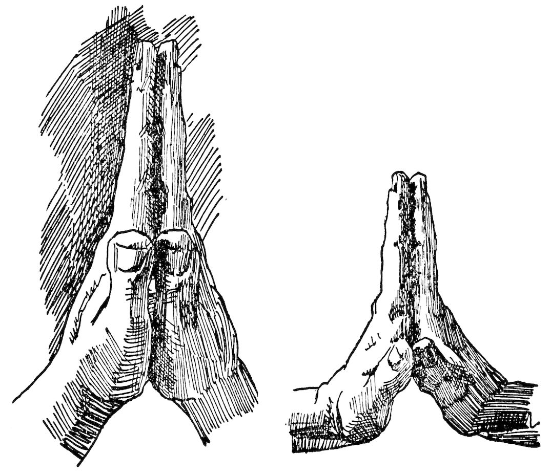 Fold the hands together, fingers interlaced. Hold them tightly closed. Now raise the first finger of the right hand and bring it back slowly with muscles tense, just as far as you possibly can, pressing the other fingers hard against the backs of the hands.
