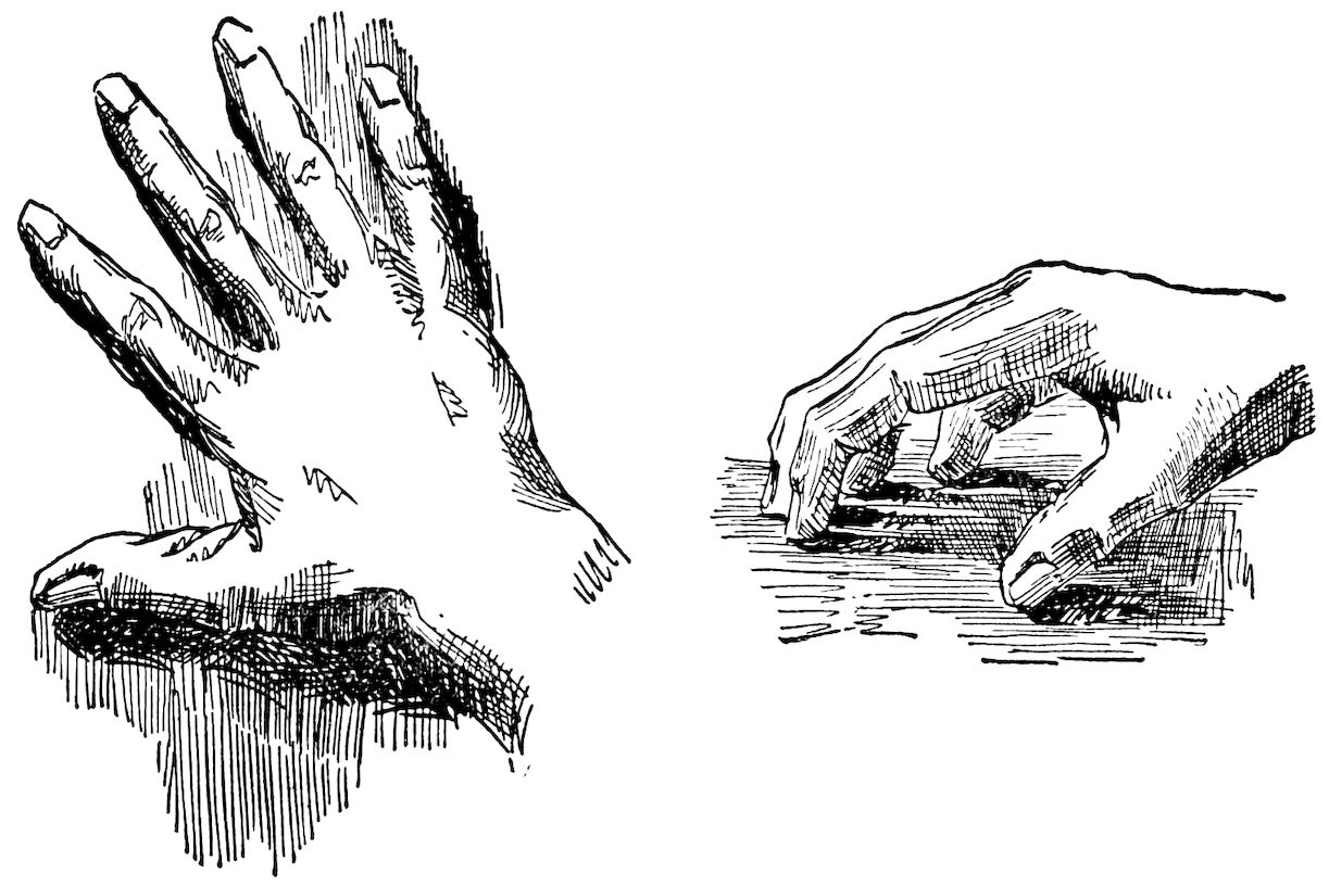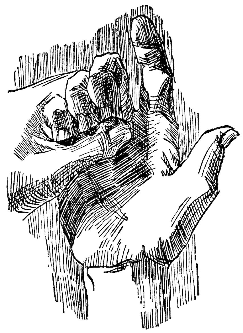 Open the left hand, thumb and fingers, all close together, turning the hand so that the thumb is towards your body and the little finger away from it. Bend the first finger at the knuckle joint, and nowhere else, and bring it down toward the palm of the hand until it is horizontal, that is at right angles to the plane of the palm and the other fingers. If it will not come down of itself, help it a little with the other hand, but be careful not to strain the left hand muscles when you are first starting this exercise. Try not to move the other fingers of the left hand while you are bending the index finger downward. Repeat this motion ten times.