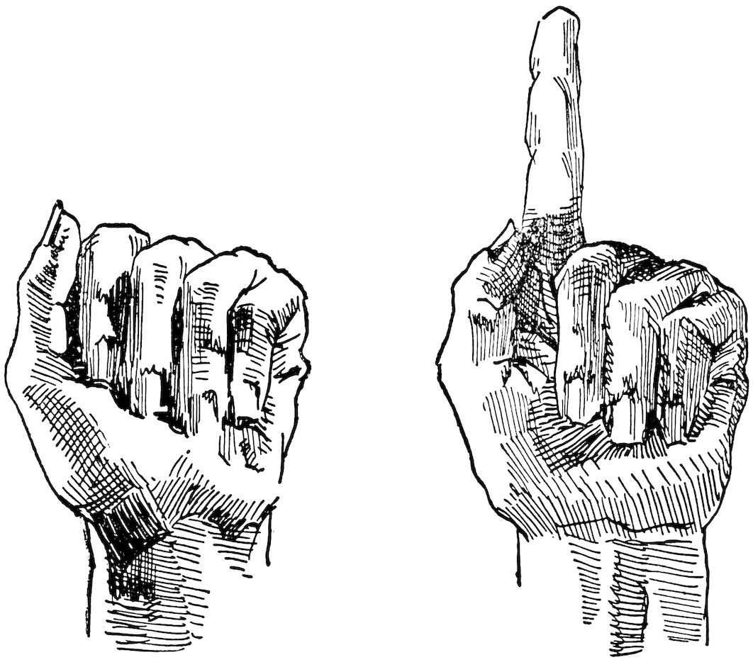 Hold your left hand up in front of you with the palm facing you. Press the index finger and the middle finger tightly together. Bring the two still held tightly together down to the palm, and then back straight again, quickly, briskly and with muscular resistance. The motion should be from the knuckle joint. Naturally the other fingers will have a tendency to curl. It makes no difference if they do. Repeat this exercise twenty times.