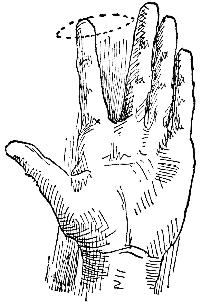 Place the hand on any flat surface and keeping it straight, raise the first finger as far as you can from the table. Do not bend any joints save that at the knuckle. Repeat this ten times using increasing muscular resistance.