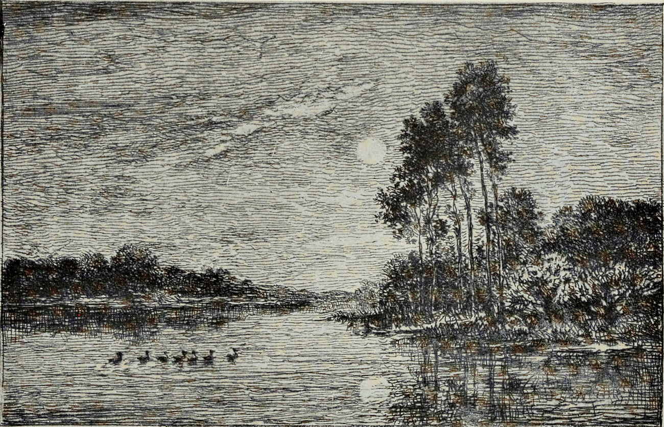 Daubigny’s success as a painter, the constantly increasing demand for his work, left him little time, as years went by, for etching. “If only I could paint a picture that wouldn’t sell,” he once said in [Pg 259]sheer desperation, and, momentarily, his superb renderings of the mystery of evening and night accomplished his object, though now they are jealously guarded in some of the world’s finest collections. But to etch night, to suggest moonlight—there was a problem indeed! Whistler in his “Nocturnes” paints, so to speak, on his plate with printer’s ink. Daubigny relies on lines alone, to produce his result. “Night cannot be etched” is the dictum of more than one authority. No, nor sunlight either, nor clouds! None of these things can be pictured so that blind eyes can see them. But to those who will meet the etcher half way, who are content with a suggestion and are capable of reconstructing from it the artist’s mood, these simple linear plates of Daubigny’s last period are a revelation and a delight. Moonlight on the Banks of the Oise measures scant four by six inches, yet what a feeling of space there is in it! Only a born etcher could have succeeded by means so simple, and seemingly inadequate, in capturing the very spirit of such a scene.