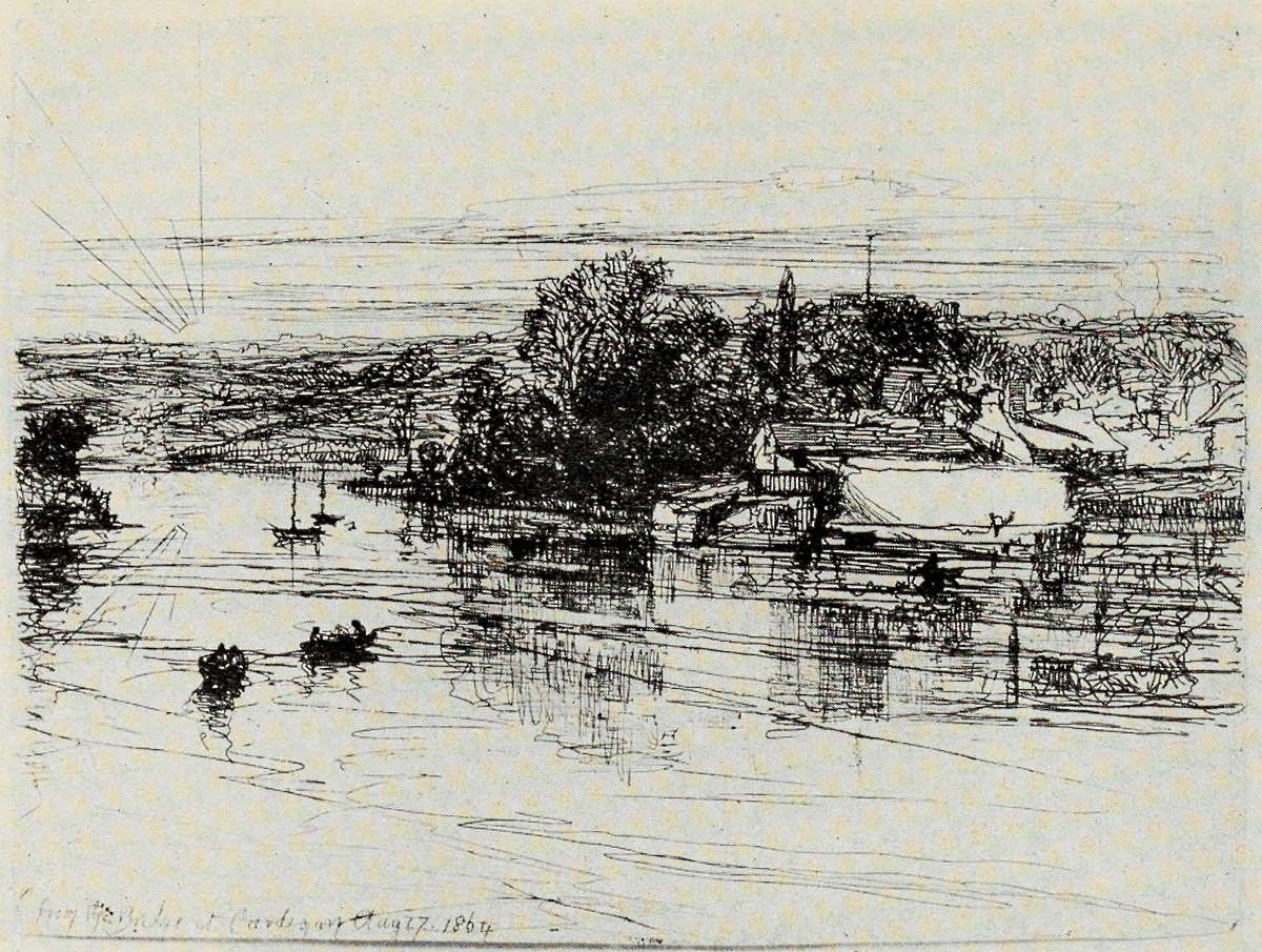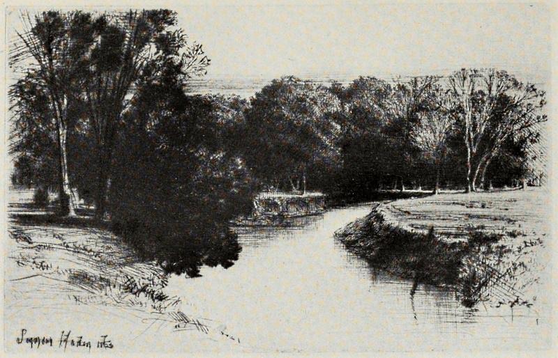 A Water Meadow (incidentally, a plate which the artist himself liked) is a fine transcript of a sudden shower in the Hampshire lowlands. It is bold and painter-like, admirable from every point of view, though some may prefer On the Test, with its truly noble sky, etched later in the day from a somewhat different point of view. Cardigan Bridge is a model of what a sketch should be, free, suggestive, spontaneous, [Pg 269]yet full of knowledge. It is one of five similar plates, etched in a single day, August 17, 1864, a “good day” indeed, such as rarely comes to etchers or to painters! The more one sees of modern etching, the more one is inclined to value work of this order. It is so easy, so fatally easy, to make wriggles in the water and scribbles in the sky; but to suggest, by these seeming careless loops and latchets, the flow of the river, the movement of clouds, the splendor of the setting sun—that indeed is another matter! Yet all this, and more, Seymour Haden has done in a magisterial manner.