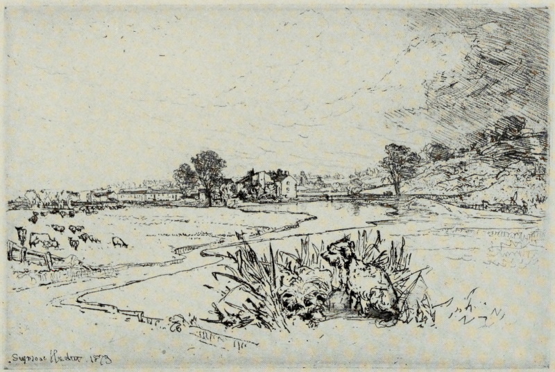 Whistler, “the greatest etcher and the most accomplished [Pg 273]lithographer who ever lived” (according to Mr. Joseph Pennell), seems to have interested himself in landscape hardly at all. Not even his most ardent disciples would assert that the master’s few purely landscape plates contribute greatly to the pyramid of his fame. But even here one must tread softly. Whistlerium tremens is still a highly contagious disease; and has not his official biographer written “All his work is alike perfect”? How then may a modest lecturer presume to praise or compare? Let Mr. Pennell speak: “Look at Rembrandt’s prints made, I do not know whether with Amsterdam or Zaandam in the background, and then at Whistler’s of the same subjects. Rembrandt drew and bit and printed these little plates as no one had up to his time. But Whistler is as much in advance of Rembrandt as that great artist was of his predecessors. In these little distant views of absolutely the same subject, Whistler has triumphed. It is not necessary to explain how: you have only to see the prints to know it.... The older master is conservative and mannered; the modern master, respecting all the great art of the past, is gracious and sensitive, and perfectly free.”