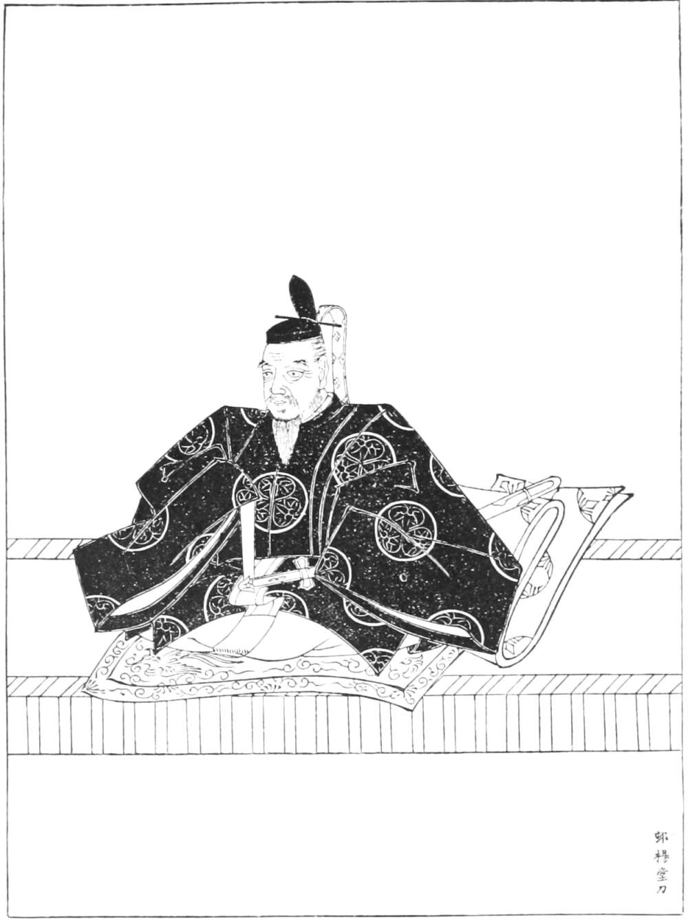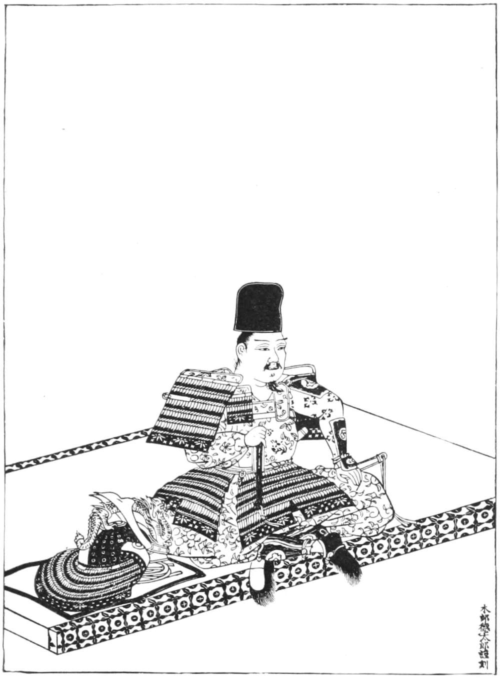 [131] The kamishimo is a state dress, composed of two garments (kami signifies what is above, and shimo what is below), a short cloak, without sleeves, called kataginu, and breeches, called hakama. Both are of a particular form (the breeches being like a petticoat sewed up between the legs), and of colored stuffs. They are used only on days of ceremony and at funerals.—Titsingh.