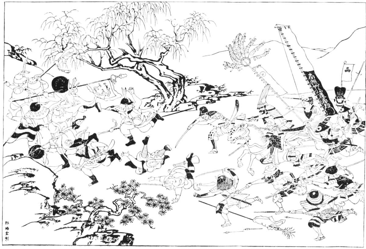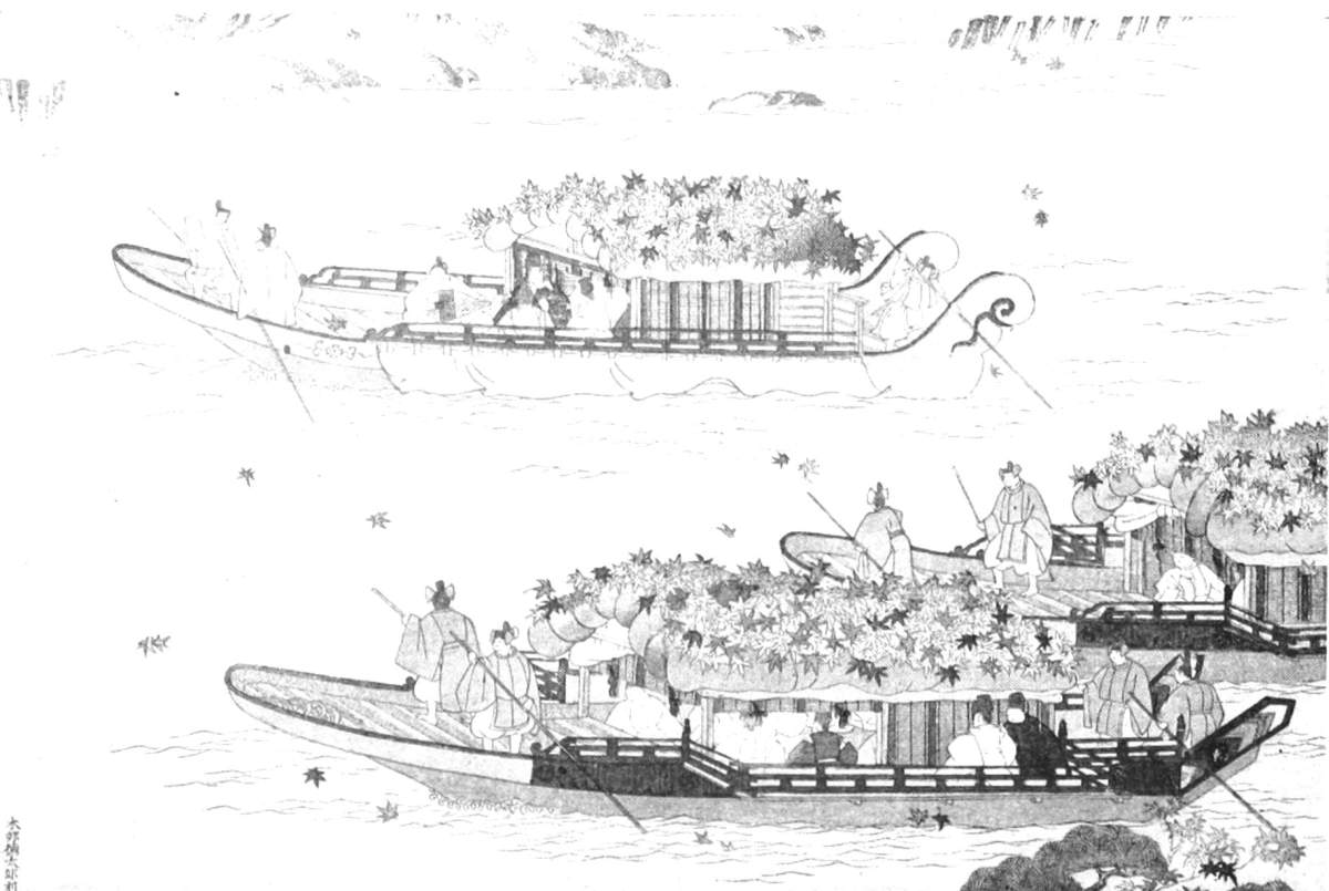 [99] Of another festival, on the 23d of October, Cocks gives the following account: “The kings with all the rest of the nobility, accompanied with divers strangers, met together at a summer-house, set up before the great pagoda, to see a horse-race. Every nobleman went on horseback to the place, accompanied with a rout of slaves, some with pikes, some with small shot, and others with bows and arrows. The pikemen were placed on one side of the street, and the shot and archers on the other, the middest of the street being left void to run the race; and right before the summer-house, where the king and nobles sat, was a round buckler of straw hanging against the wall, at which the archers on horseback, running a full career, discharged their arrows, both in the street and summer-house where the nobles sat.” This, from the date, would seem to be the festival of Tenshō Daijin. See p. 359. Caron, “Relation du Japon,” gives a similar description.