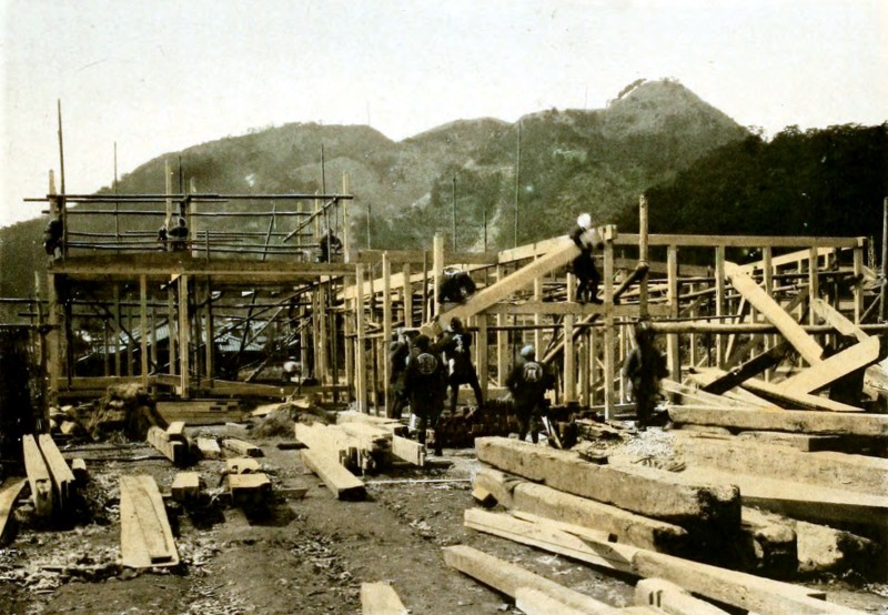The incessant work of ten of the carpenters for two months has so progressed that every pole and railing is properly planed and skillfully shaped, measured and holed so that each piece fits the other so as to complete the building or framing of the house. Here they are making the preparation for the building or framing work.