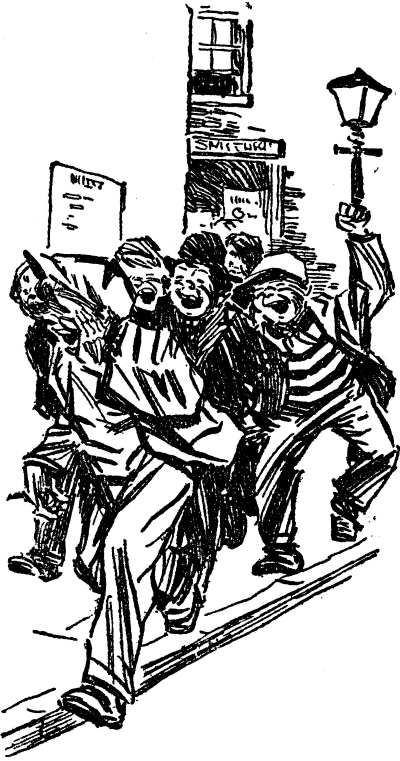 “Look at ’im!” he shrieked mirthfully. “Look at ’im. Nakid—jus’ dressed in a muff—Oh! look at ’im.”