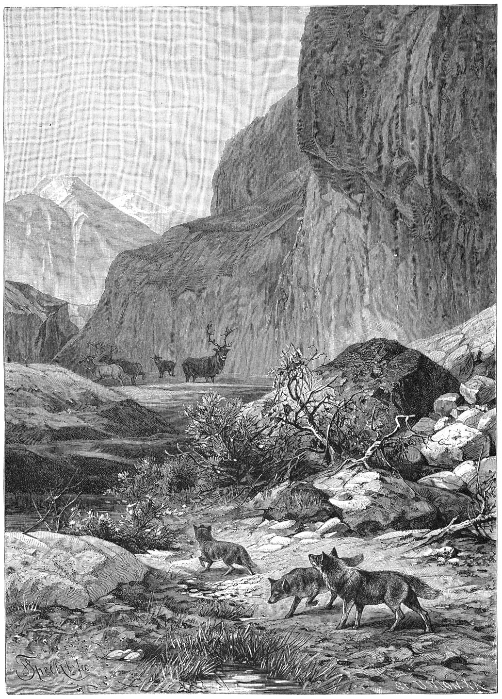 Deze ruischende beken, die langs elke insnijding dalwaarts spoeden, [3]de glinsterende waterstrepen, die tegen elken rotswand hangen, de als rook opstijgende damp, die de aanwezigheid der meest verborgen watervallen verraadt, zij zijn het, die het leven oproepen in de ijzigste wildernis, op plaatsen, waar het oog overigens niets ontwaart dan rots en lucht, terwijl zij tevens wijzen op het daarachter gelegen land.