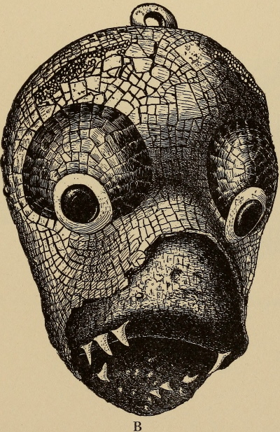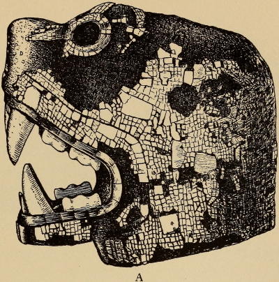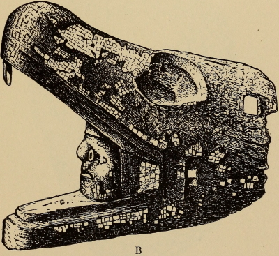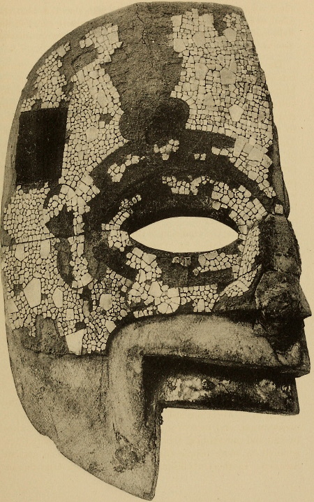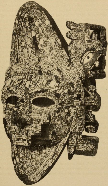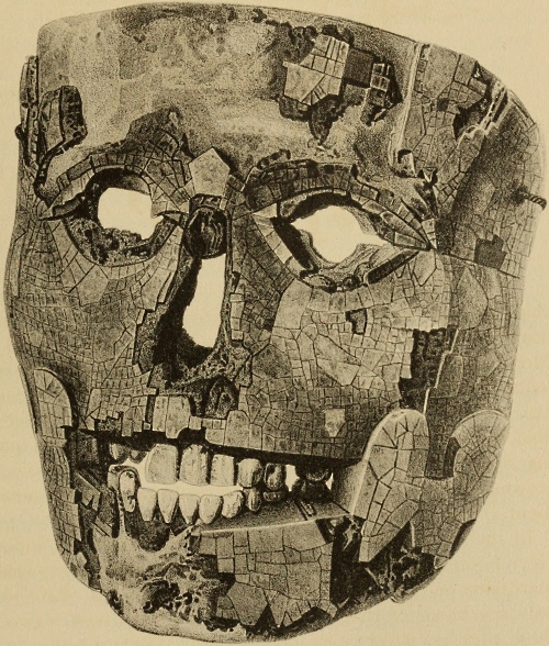 Under the title “Montezuma’s Gifts to Cortés,” Maudslay describes (Appendix, pp. 299-302) and illustrates (pl. 13-16) the three mosaic masks in the British Museum. Pl. 16 is a rear view of the skull mask showing the leather strap by which it was attached to the head. This mask Maudslay identifies as probably that of Tezcatlipoca, and the other two as belonging to Quetzalcoatl.