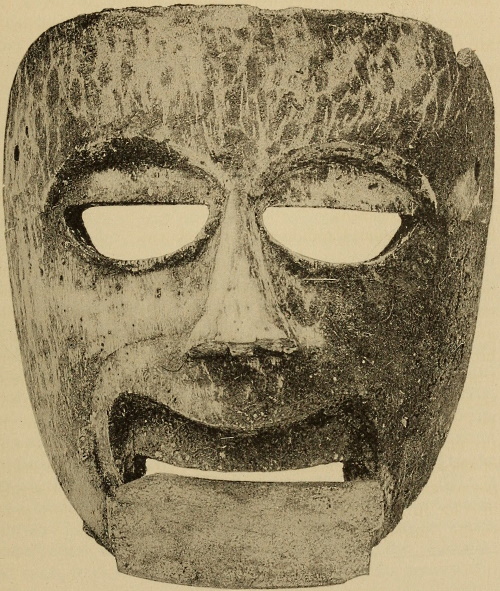 Describes (p. 539) and illustrates (pl. XLVI) the mosaic wooden mask found in 1908 in a cave in an arroyo on the headwaters of a small stream flowing into the Rio Chamelecon, about 25 miles distant from the ruins of the ancient city of Naco. This specimen is now in the Museum of the American Indian, Heye Foundation. See our pl. XVII.