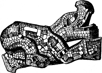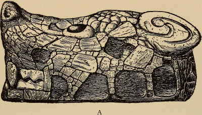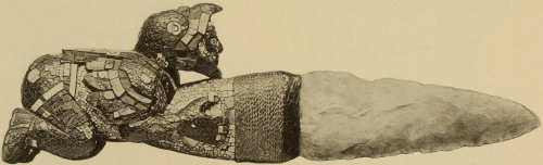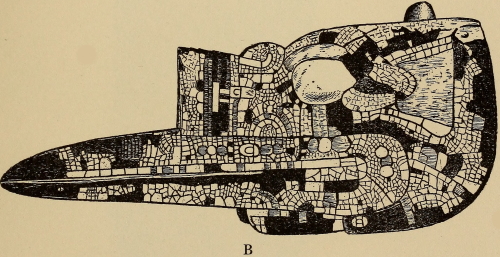 Dr. Peñafiel, in chapter XXIII, under the heading “Incrustaciones de Mosaico,” describes some of the mosaic pieces in Europe which he states are the most important specimens. “Of this class of works the Museo Nacional (Mexico) can count as having only one, in the statue of Coatlicue coming from Tehuacan.” On pl. 26 are given the British Museum knife, and the two knife-handles in Rome; on pl. 117 one of the masks in Rome; on pl. 118(A) the skull mask in Berlin, and (B) the mask in Rome; pl. 123 is the femur musical instrument in Rome; and pl. 168 restorations of the knife-handle specimens with blades, in Rome. These illustrations are all in colors, excepting the last.