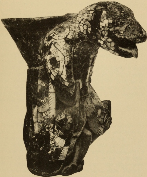 The writer has undertaken the present study of Mexican Turquois Mosaics in honor of the approaching opening to the public of the Museum of the American Indian, Heye Foundation, the only institution devoted exclusively to the study of the aboriginal American peoples ever established; and the proximate International Congress of Americanists to be held at Rio de Janeiro this summer. Owing to lack of time it has been impossible to obtain new photographic illustrations of all the specimens of mosaic-work in European museums, but the author desires to express his thanks to T. A. Joyce, Esq., for his courtesy in furnishing photographs of the examples in the British Museum. To Dr. Franz Heger, of the State Natural History Museum, Vienna, we are under deep obligations for photographs and description of the interesting Xolotl figure preserved in that Museum. Dr. S. K. Lothrop has kindly had photographs made of the objects of this class in the Prehistoric and Ethnographic Museum in Rome, and has made certain valuable observations concerning them. To Drs. A. M. Tozzer and H. J. Spinden special acknowledgment is due for their generous permission to illustrate the mosaics from Chichen Itza, thus anticipating their own description of the objects in the work now being prepared regarding one of the most important discoveries ever made in ancient America. The fine drawings are from the pen of William Baake, and the beautiful plates represent the best efforts of the Heliotype Company. Finally must be acknowledged the characteristic generosity of one of the trustees of the Museum, James B. Ford, Esq., who has made it possible for us to publish this paper, and to whom the Museum is indebted for its acquisition of the precious collection of Mexican mosaics which are now described for the first time.