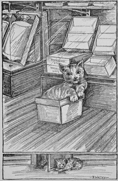 Another thing which attracted much attention from the employees and customers was that Tiger would try to get into any kind of box left open or set out for him. He never forgot this and after becoming a full grown cat he would try to get into little boxes. Sometimes Frank or one of the clerks would give him a small paste board box and tell him to lie down in it. He would turn ’round and ’round in it until the sides were mashed and then he would lie down on the flat piece of the box. Sometimes they would give him a very small pill box and he would try to get into it. He would walk all around it and at last would lie down on top of it.