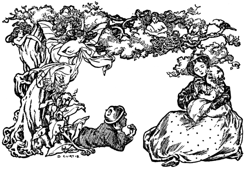 At last his father noticed him. He did not look at all surprised, but just beckoned to him with his finger to come in. So Jack did, and[Pg 205] got upon his father’s knee, where he curled himself up comfortably, laid his head on his father’s waistcoat, and wondered what he would think if he should be told about the fairies in somebody else’s waistcoat pocket. He thought, besides, what a great thing a man was; he had never seen anything so large in Fairyland, nor so important; so, on the whole, he was glad he had come back, and felt very comfortable. Then his mother, turning over the leaf, lifted up her eyes and looked at Jack, but not as if she was in the least surprised, or more glad to see him than usual; but she smoothed the leaf with her hand, and began again to read, and this time it was about the Shepherd Lady:—