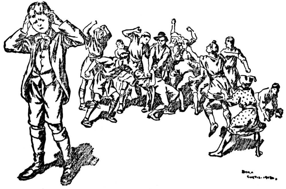 The fairies were very attentive to this song; they seemed, if one may judge by their looks, to think it was rather a serious one. Then they drank Jack’s health, and afterwards looked at him as if they expected him to sing too; but as he did not begin, he presently[Pg 195] heard them whispering, and one asking another, “Do you think he knows manners?”