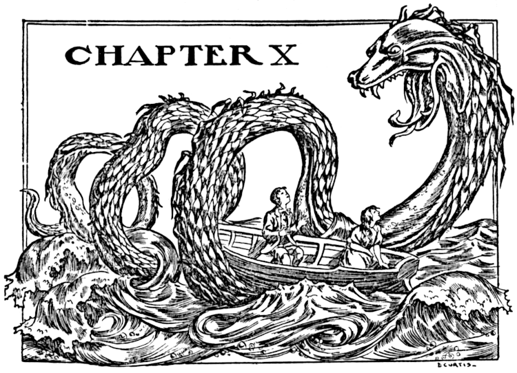 “Those heads had no beaks, I am sure,” said Jack, and he stood on tiptoe and poked in one of his fingers. “And the things have no feathers,” he continued; so, the hollow being rather rugged, he managed to climb up and look in.