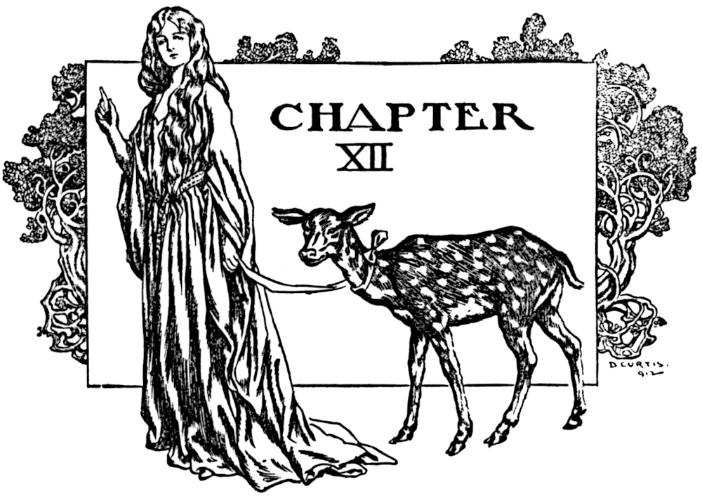 “As she spoke they crept into corners, and covered the dame’s head with a veil. And all that day it was dark and gloomy, and nothing happened, and all the next day it rained and rained; and they thrust the dame[Pg 185] into a dark closet, and kept her there for a whole month, and still not a ray of sunshine came to do them any damage; but the dame faded and faded in the dark, and at last they said, ‘She must come out, or she will die; and we do not believe the sun will ever shine in our country any more.’ So they let the poor dame come out; and lo! as she crept slowly forth under the dome, a piercing ray of sunlight darted down upon her head, and in an instant they were all changed into deer, and the child-king too.