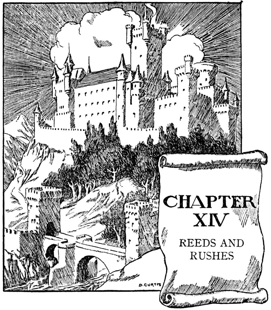 The sun was just touching the tops of the purple mountains when Jack lost sight of Mopsa’s home; but he remembered how he had penetrated the bed of reeds in the morning, and he hoped to have the same good fortune again. So on and on he walked,[Pg 202] pressing his way among them as well as he could, till the sun went down behind the mountains, and the rosy sky turned gold colour, and the gold began to burn itself away, and then all on a sudden he came to the edge of the reed-bed, and walked out upon a rising ground.