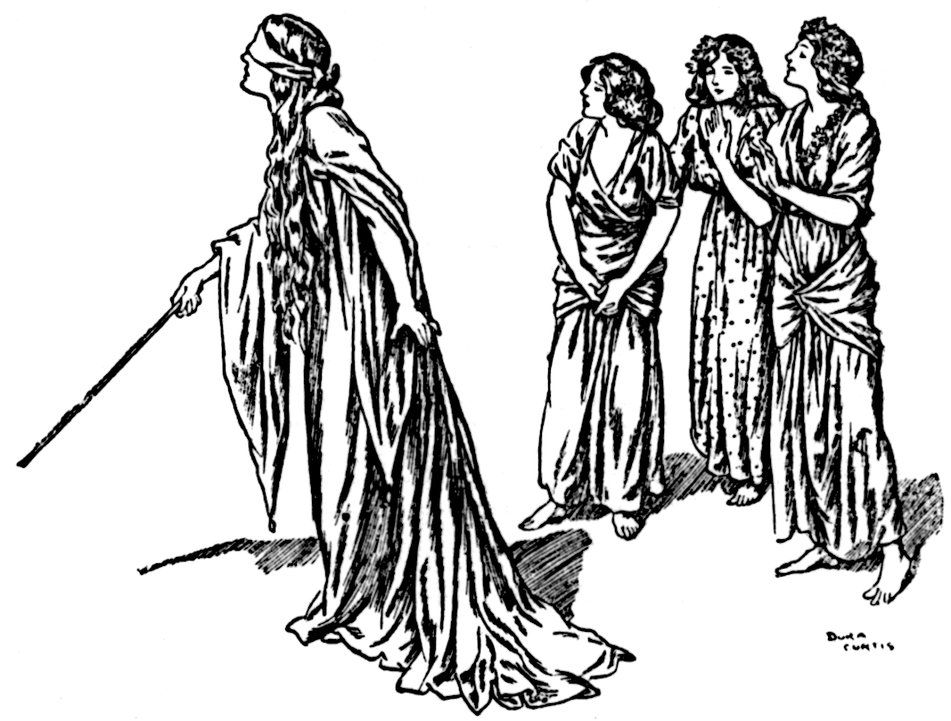 But still Mopsa walked on blindfold, and the wand pointed at the rock till it touched it, and she said, “Who is stopping me?”