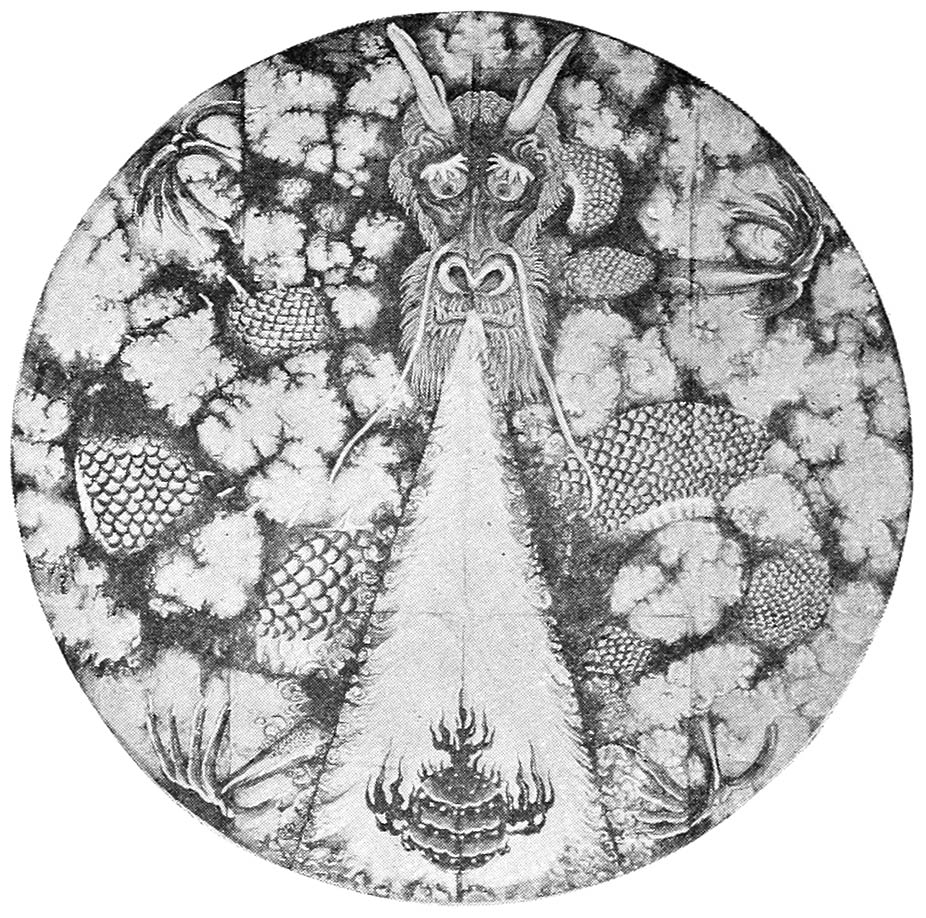 This lifelike creature, symbolic of imperial power, adorns one of the walls within the palace ground of Peking. Here, as in most representations, the dragon is shown gazing longingly at the flaming sun. He desires, we are told, not so much to seize that heavenly body as to learn the secret of its brilliance, so that it may add to his own glory.
